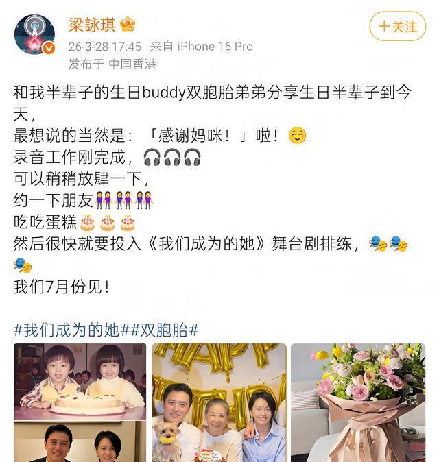 从晒出的动态不难看出,梁咏琪的生日过得简单又充实,有家人的陪伴、朋友的相聚,还有热爱的事业在前方等待。这份对生活的热忱、对家人的感恩,也让她在岁月里愈发从容闪耀。让我们一起祝福梁咏琪生日快乐,也期待7月,在《我们成为的她》的舞台上,看到她带来的精彩演绎。