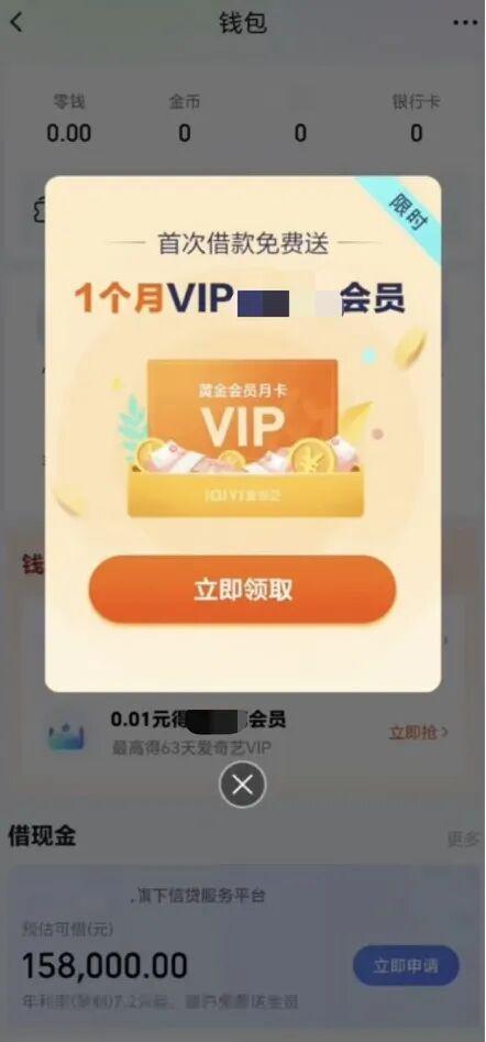 △某视频平台“免费领1个月VIP”,点击后会跳转到借贷申请页面。
