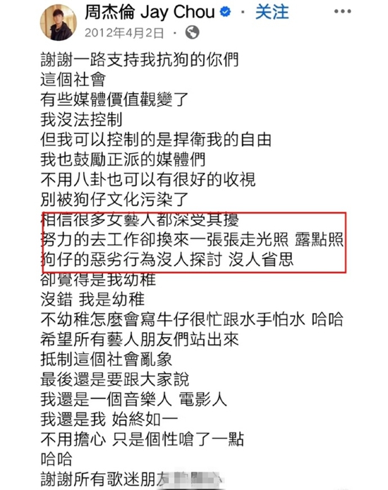 这段引发热议的发言,来自周杰伦2012年4月2日的公开发文。当时,狗仔偷拍女艺人隐私、恶意炒作的现象愈演愈烈,他看不惯这种乱象,公开挺身而出,明确批评狗仔偷拍女艺人隐私、恶意捕捉不当画面的恶劣行径,更犀利点出社会上的双标现状——大众往往忽视狗仔的违法行为,反而指责受害女艺人“穿着暴露”“不自重”。